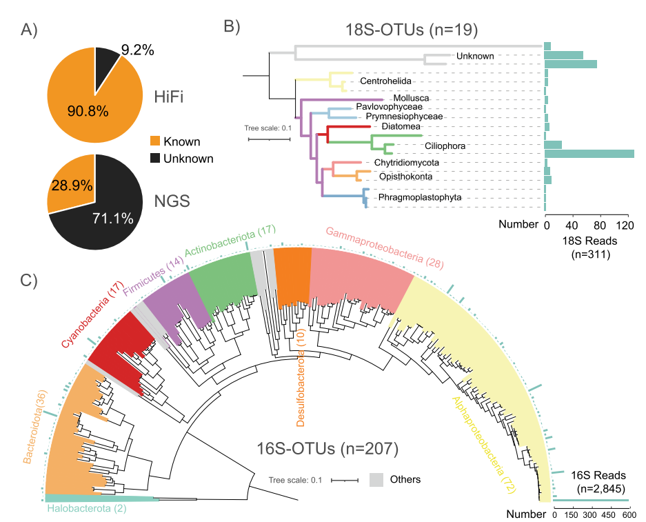 基于HiFi reads的分類分辨率。(A) HiFi和NGS讀數(shù)具有(已知)/不具有(未知)分類信息的百分比。(B和C)基于19個(gè)全長(zhǎng)18S-OTUs (B)和207個(gè)全長(zhǎng)16S-OTUs (C)的系統(tǒng)進(jìn)化樹